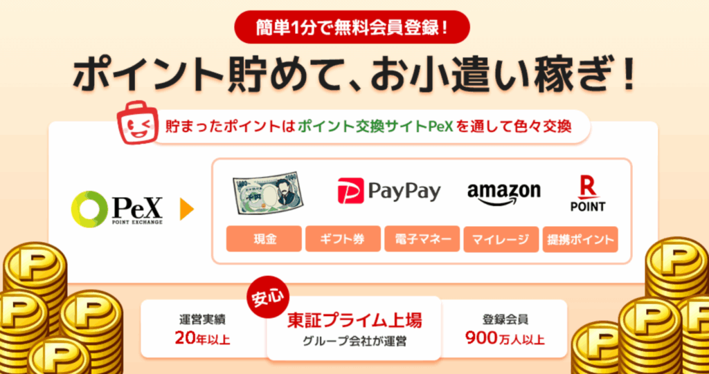 ECナビは日本最大級のポイントサイトとして知られ、掲載案件数・ポイント還元数ともに業界トップクラス。ネットショッピング、アンケート、サービス利用、アプリダウンロードなど、日常のさまざまな行動で効率的にポイントが貯まります。特に主婦層からの支持が厚く、「家計の足しにできる」「スキマ時間で簡単に稼げる」と高評価。運営会社は上場企業グループで信頼性も抜群です。またポイント交換時には「Pex」を利用することで、現金・ギフト券・各種ポイントにスムーズに交換可能。貯めやすさ・安全性・使いやすさの3拍子が揃った、初心者にも最もおすすめのサービスです。