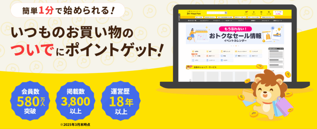 ハピタスは「1ポイント=1円」でわかりやすく、初心者に人気のポイントサイト。特にネットショッピングとの相性が良く、楽天・Yahoo!ショッピング・Booking.com など主要サイトと連携している点が強みです。広告利用によるポイント還元率も高く、キャンペーン時の増額も魅力。サイトデザインがシンプルで、初めてでも迷わず操作できるのが特徴。安全性にも定評があり、長年の運営実績から信頼度は高いサイトです。